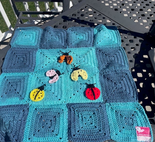 Depending on how many we receive, we will make those into binkies and show them off. We will take a photo of your block with your name so we know who all contributed to each binky. We’ll send you a photo of the finished one.